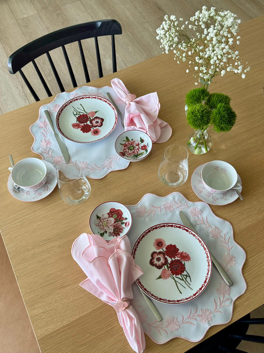 Embroidered pale pink florals bloom delicately across this pastel placemat. Romantic and graceful, it’s a floral dream for spring and summer gatherings.