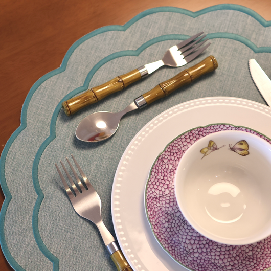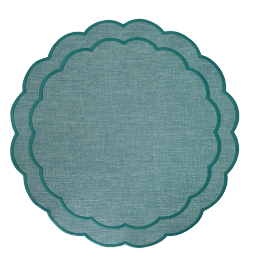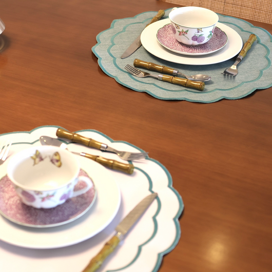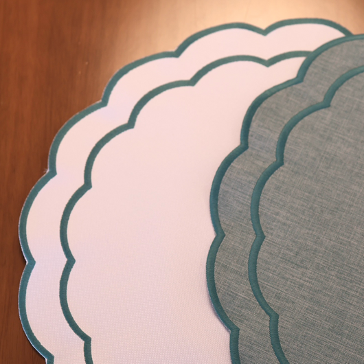 Add a touch of effortless elegance to your table. The Green Breeze placemat features a double-faced design in soft green shades with delicate scalloped edges — timeless, fresh, and versatile. One placemat, two ways to use it: green and white.