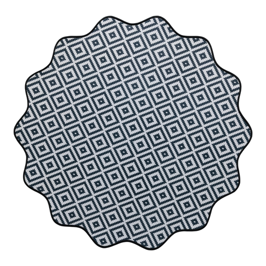 The Noir Diamond features a bold black-and-white geometric pattern, accented by a scalloped edge that softens its modern lines with a touch of femininity.
