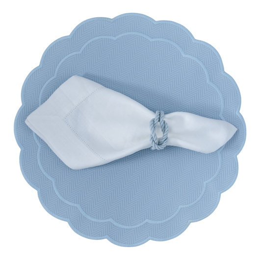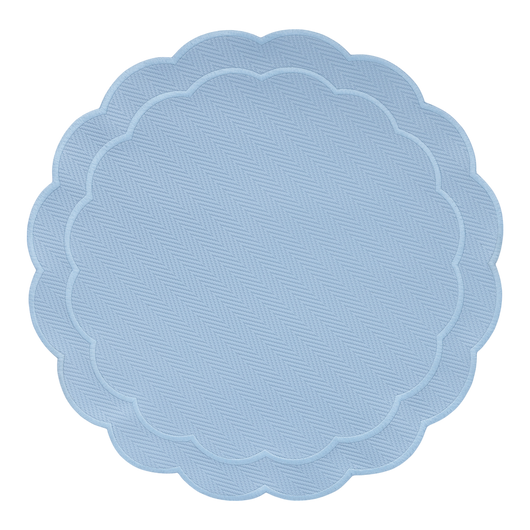 The Serenity Blue Set brings a refined sense of calm to your table with its soothing pastel hue and delicately scalloped silhouette. Subtle herringbone texture adds depth while maintaining a clean, timeless look. Double face.