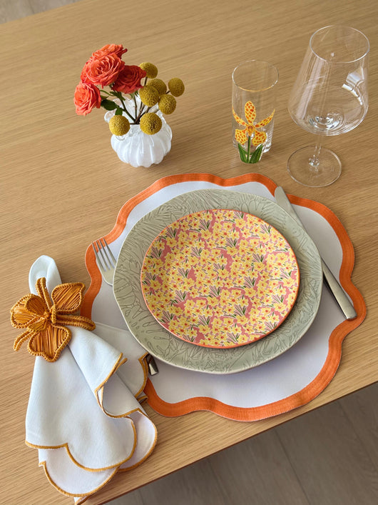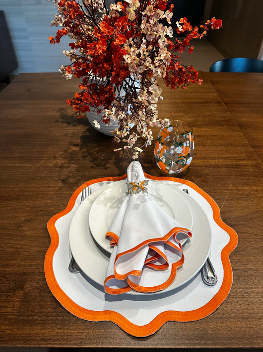 Inspired by golden-hour glow, this placemat adds warmth and brightness with its vivid orange border and graceful curves.