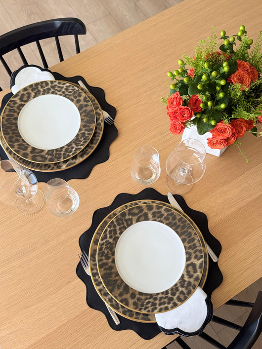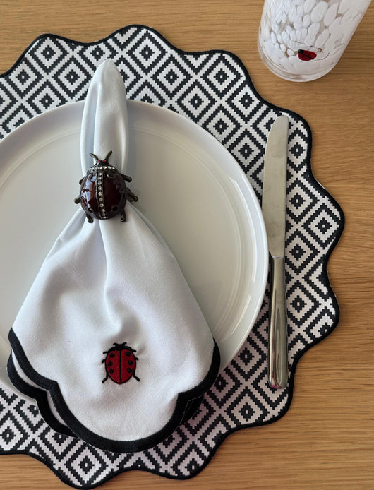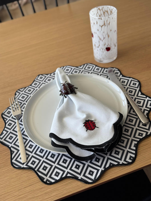 The Noir Diamond placemat double-face features a bold black-and-white geometric pattern, accented by a scalloped edge that softens its modern lines with a touch of femininity.