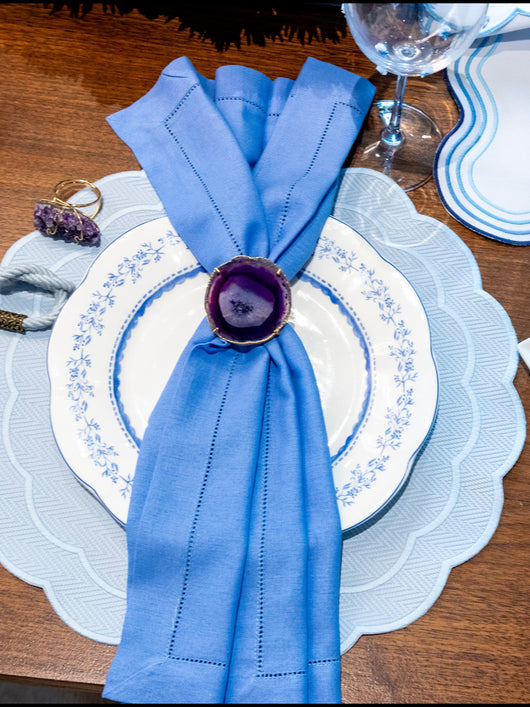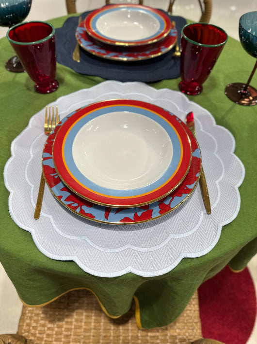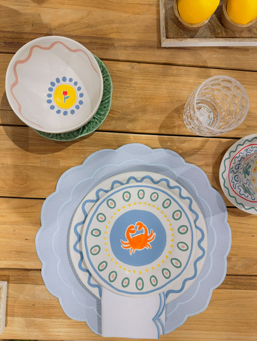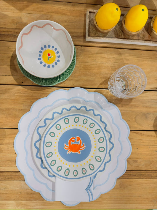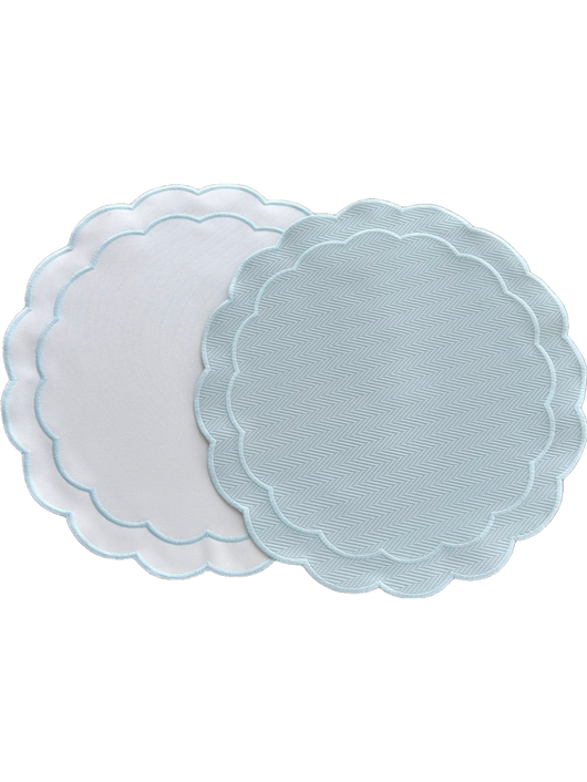 The Serenity Blue placemats brings a refined sense of calm to your table with its soothing pastel hue and delicately scalloped silhouette. Subtle herringbone texture adds depth while maintaining a clean, timeless look.